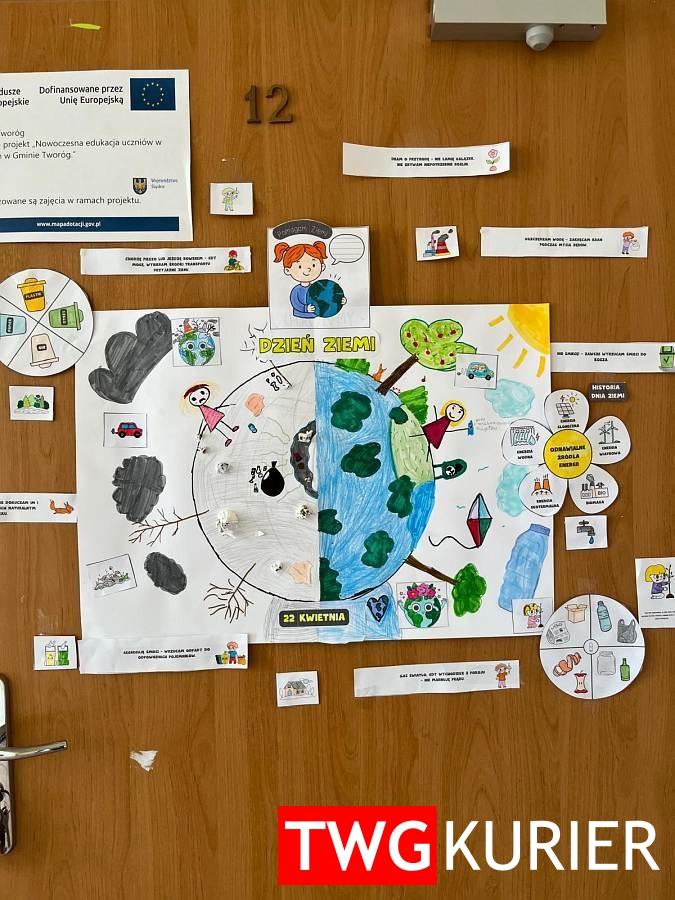 W tych dniach cała szkoła promowała ochronę środowiska oraz poszerzała świadomość ekologiczną. Podczas lekcji wychowawczych poświęconych tematyce ekologicznej, uczniowie oglądali filmy o tematyce związanej z Dniem Ziemi, wykonywali klasowe plakaty, które zostały umieszczone na drzwiach każdej Sali, układali puzzle-kolorowanki w rozmiarze XXL, przedstawiające właściwe zachowania ekologiczne, które po sklejeniu posłużyły każdej klasie jako tło do wykonania pamiątkowego klasowego zdjęcia. Klasy młodsze dodatkowo wykonywały prace plastyczne „Moje miejsce na Ziemi”. Wszystkie klasy brały także udział we wiosennym sprzątaniu Świata, podczas którego porządkowały tereny zielone wokół szkoły oraz w okolicach rzeki Stoły i pobliskiego stawu. Dzięki uprzejmości Urzędu Gminy w Tworogu, dzieci zostały zaopatrzone w rękawice ochronne i worki, zaś zebrane śmieci zostały nieodpłatnie odebrane spod szkoły na wysypisko.