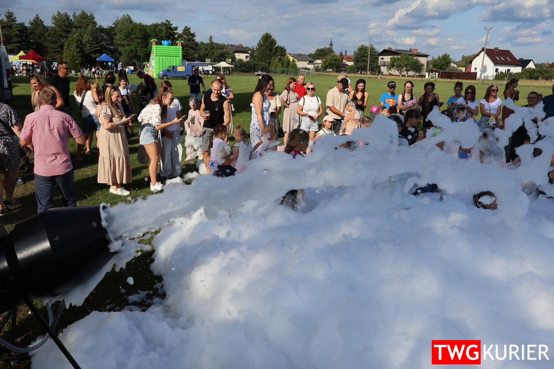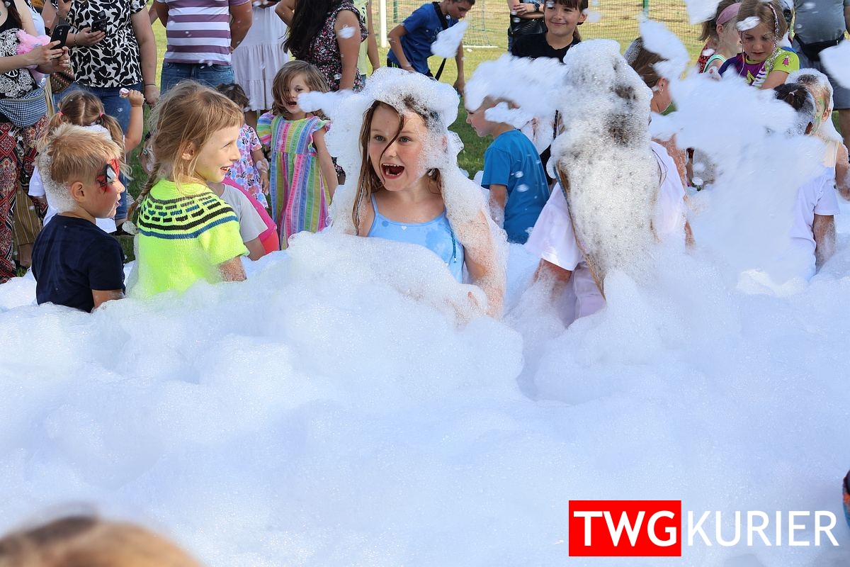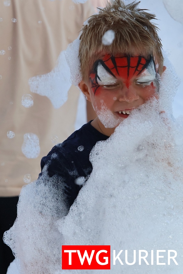 Były gry zręcznościowe, malowanie twarzy, popcorn, wata cukrowa, dmuchana zjeżdżalnia i absolutny hit dnia – piana party, czyli kąpiel w bąbelkach bez konieczności mycia naczyń. Kiermaszowe stoiska kusiły niespodziankami, słodkościami i grillowymi aromatami, a dla fanów adrenaliny czekała jazda quadem i przejażdżka sportowym wozem patrolowym – bez mandatu, za to z uśmiechem.