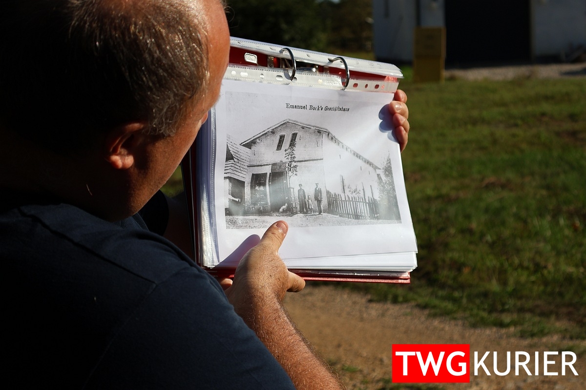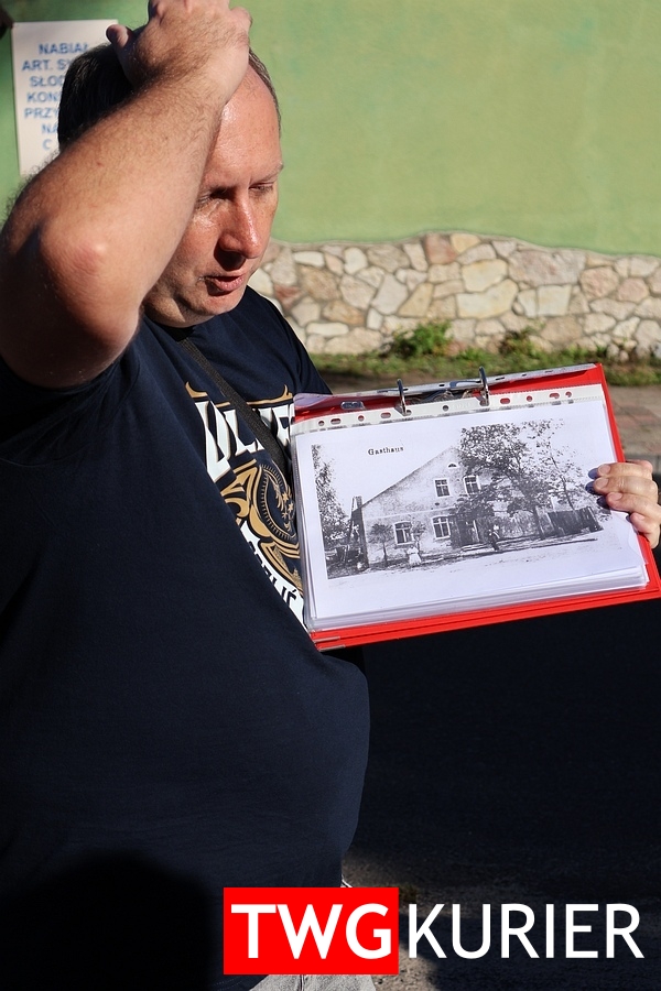 Naprzeciwko kościoła poznaliśmy historię dawnej karczmy – pełną dat, faktów i zabawnych anegdot, zwłaszcza tych związanych z nadużywaniem serwowanych tam trunków.