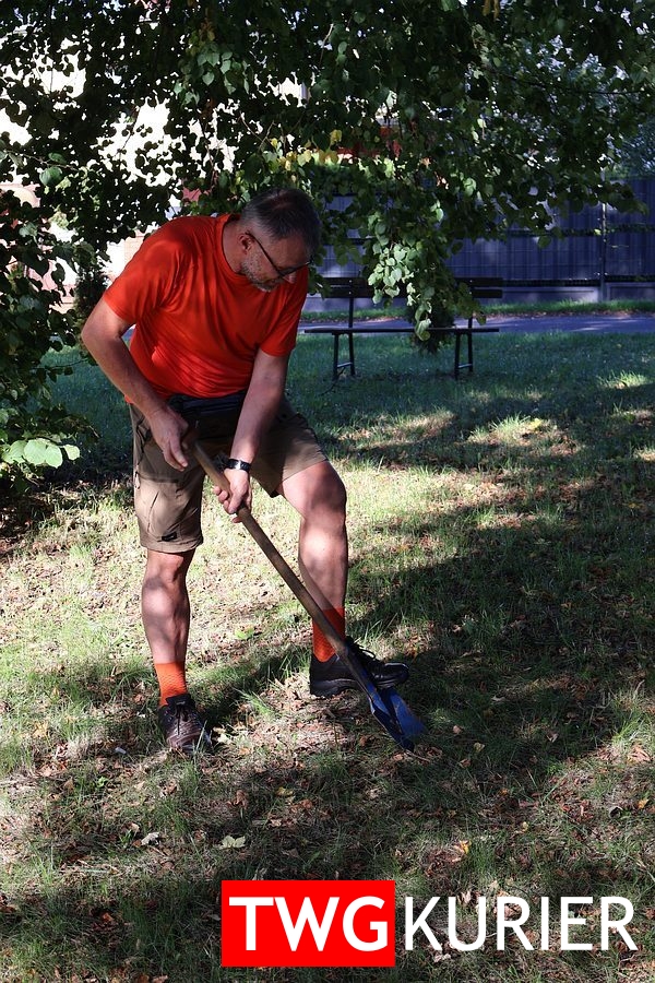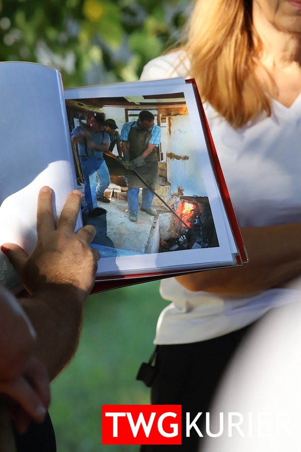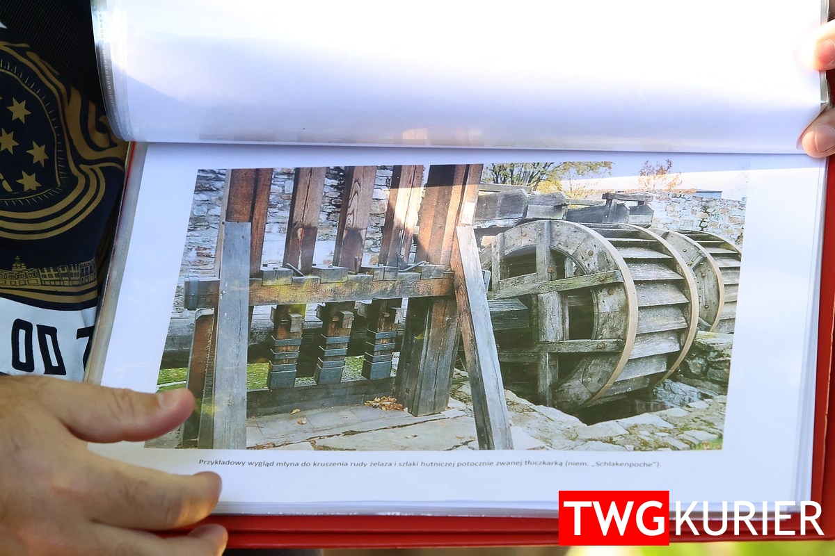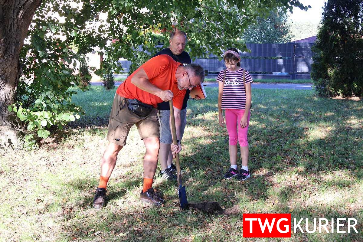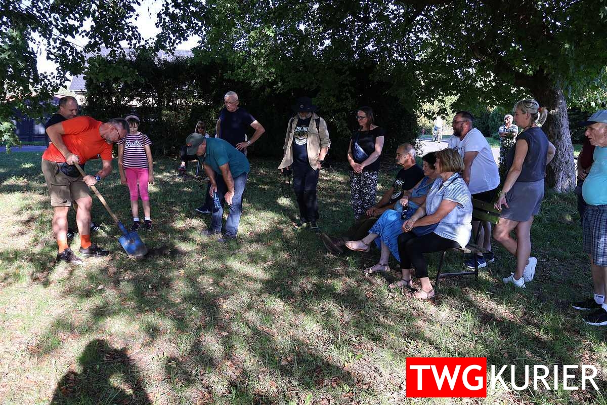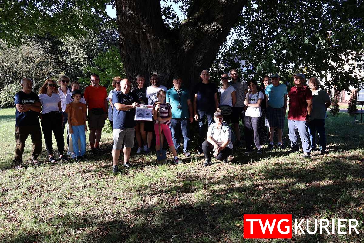 Pod wiekową lipą wkroczyliśmy w dzieje lokalnego hutnictwa. Uczestnicy mieli okazję samodzielnie wbić szpadel w ziemię i przekonać się, że warstwa szlaki – odpadu po wytopie żelaza – wciąż jest obecna. Sama lipa, według szacunków Pana Michała, liczy około 230 lat. W pobliżu, na terenie prywatnej posesji, odkryliśmy lokalizację dawnej huty oraz pozostałości kanału wodnego.