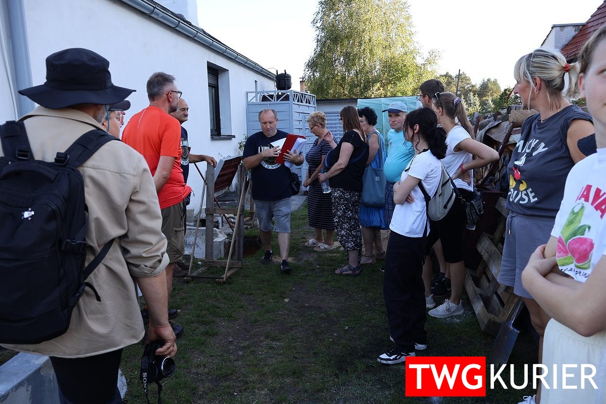 Zebrała się liczna grupa entuzjastów, którzy wsłuchani w opowieść Pana Michała, towarzyszyli mu w niespiesznej wędrówce uliczkami Kotów. Na początek poznaliśmy historię przedszkola przy ul. Szkolnej 3 – dlaczego jest drewniane, a nie murowane? Tło historyczne, nakreślone z rozmachem, ujawniło zaskakujące powiązania, pokazując, jak sknerstwo potrafi wpłynąć na bieg wydarzeń.