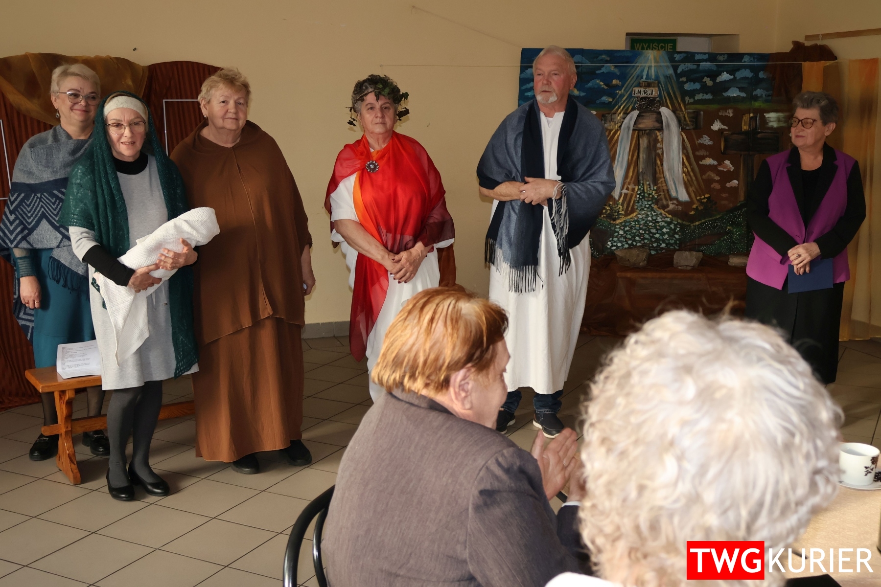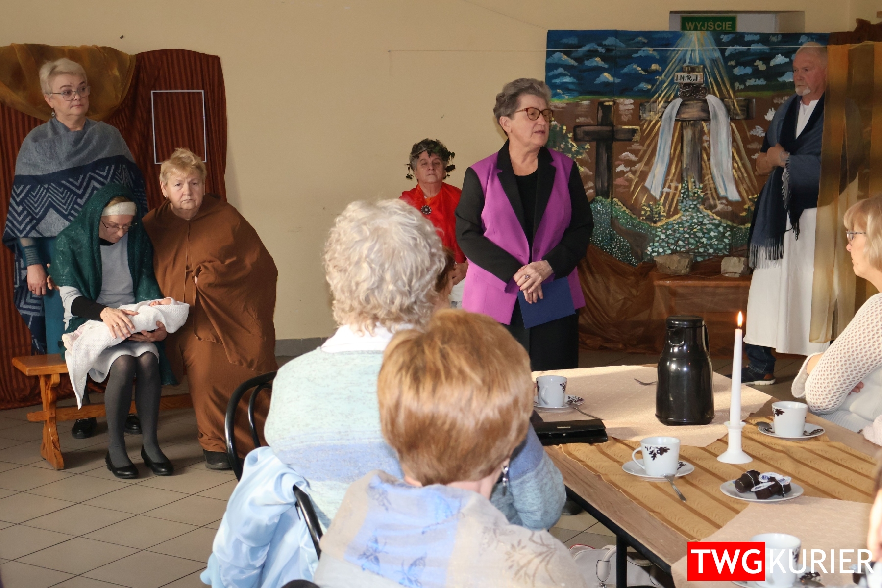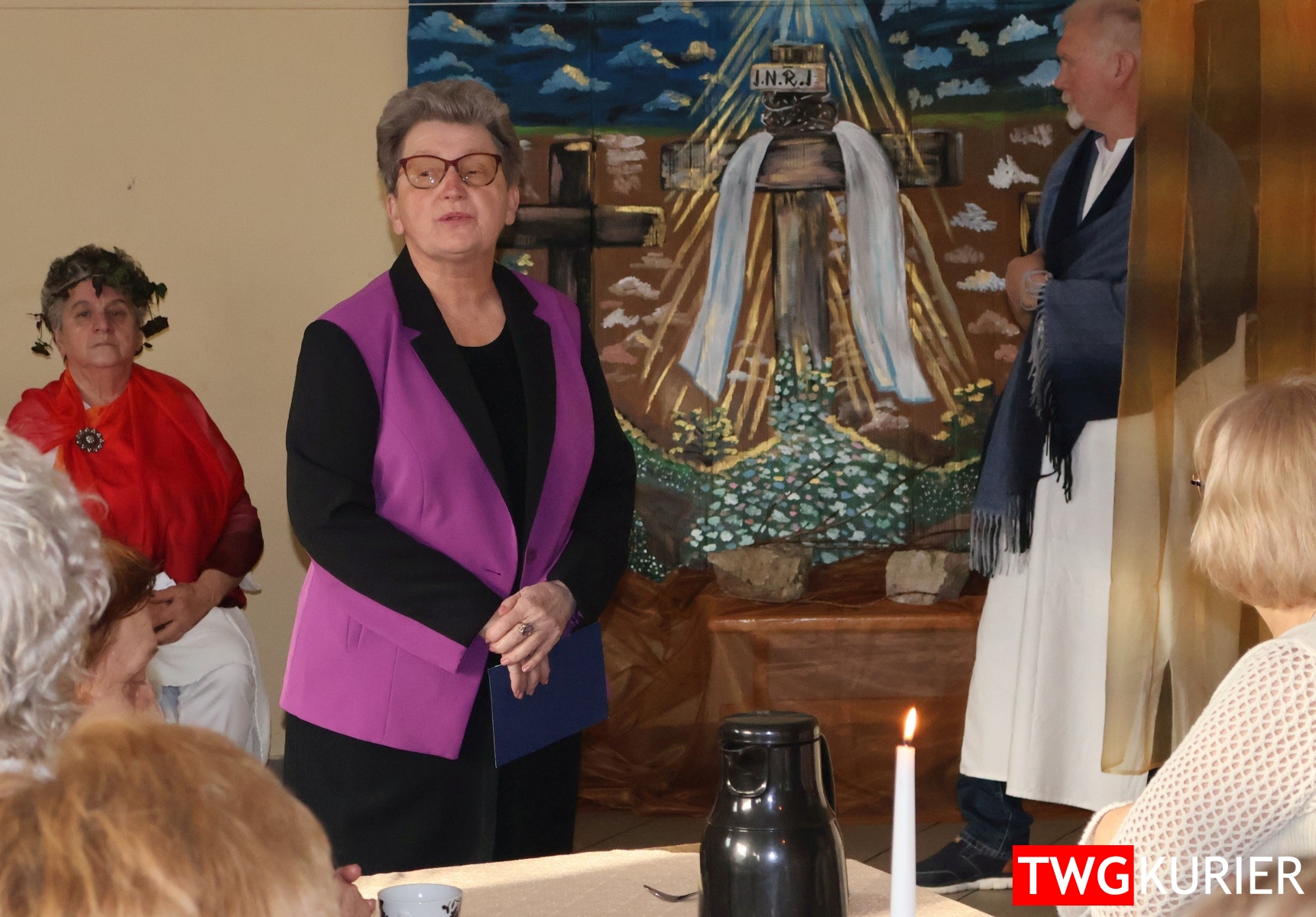 W niewielkiej świetlicy w Nowej Wsi Tworoskiej usłyszeliśmy „Lament Madonny”, który autentycznie wzruszył, a dzięki dekoracji udało się „wyczarować” fragment Jerozolimy. Inscenizację przygotowano na podstawie oryginalnego tekstu, który na potrzeby sceniczne został wzbogacony przez Barbarę Izworską o kilka kwestii. Dekorację (część malowaną) wykonała Sonia Rekus, natomiast o scenograficzną całość zadbała Joanna Bykalska. – Bardzo dziękuję wszystkim aktorom i osobom zaangażowanym w przygotowanie inscenizacji. W sposób szczególny dziękuję Pani Basi za to, że po raz kolejny nas zmotywowała – podsumowała przewodnicząca Klubu, Natalia Frączek.
