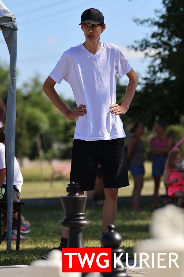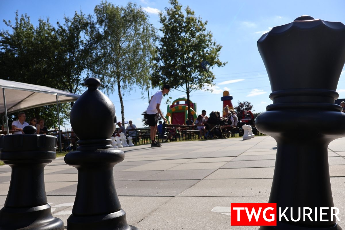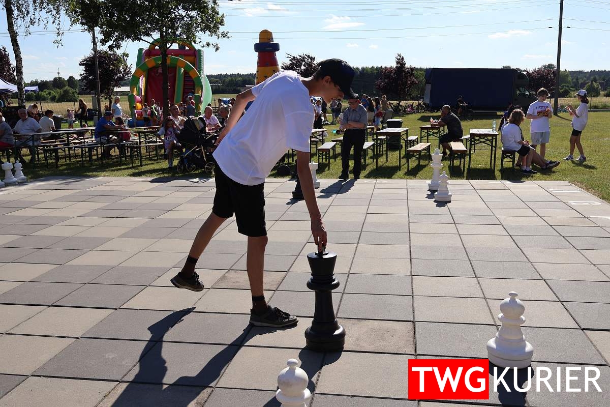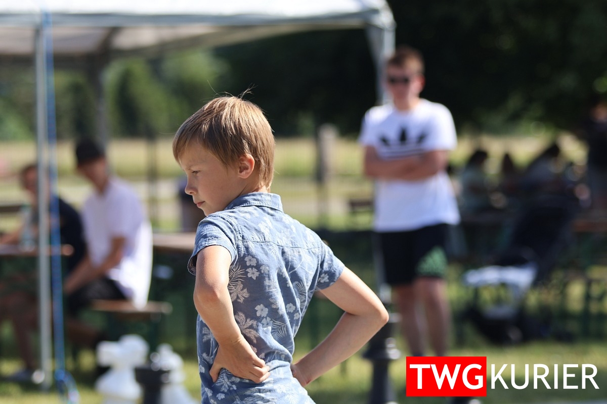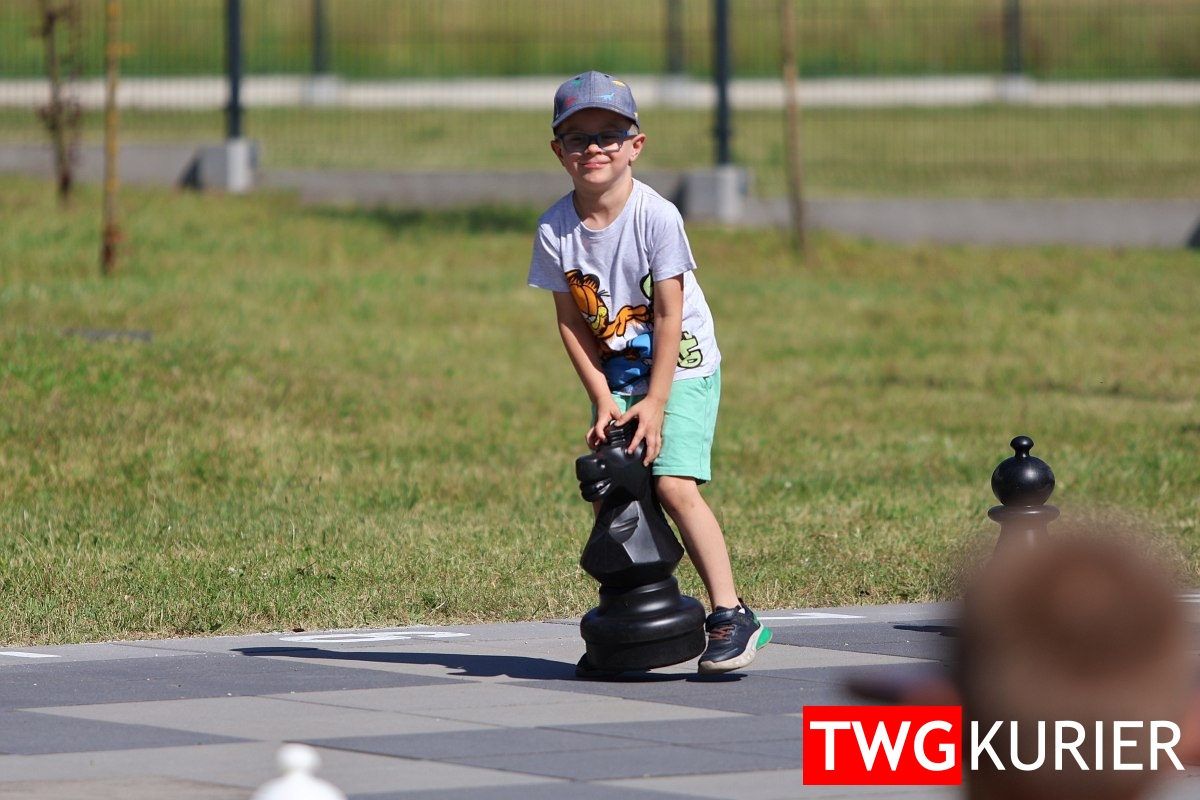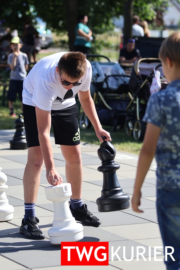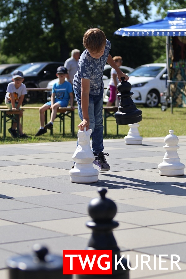 Na początek – cisza, skupienie, intelektualne napięcie. Plenerowy turniej szachowy rozgrywany na gigantycznej terenowej planszy przypominał sceny z filmów o królewskich pojedynkach. W kategorii juniorów zwyciężył młody taktyk Łukasz Hajda, a wśród seniorów triumfował Pan Józef Tronina. Całości przewodził szachowy komentator, Pan Bernard Opara – jego opowieści o strategiach nadawały grze nowy wymiar.