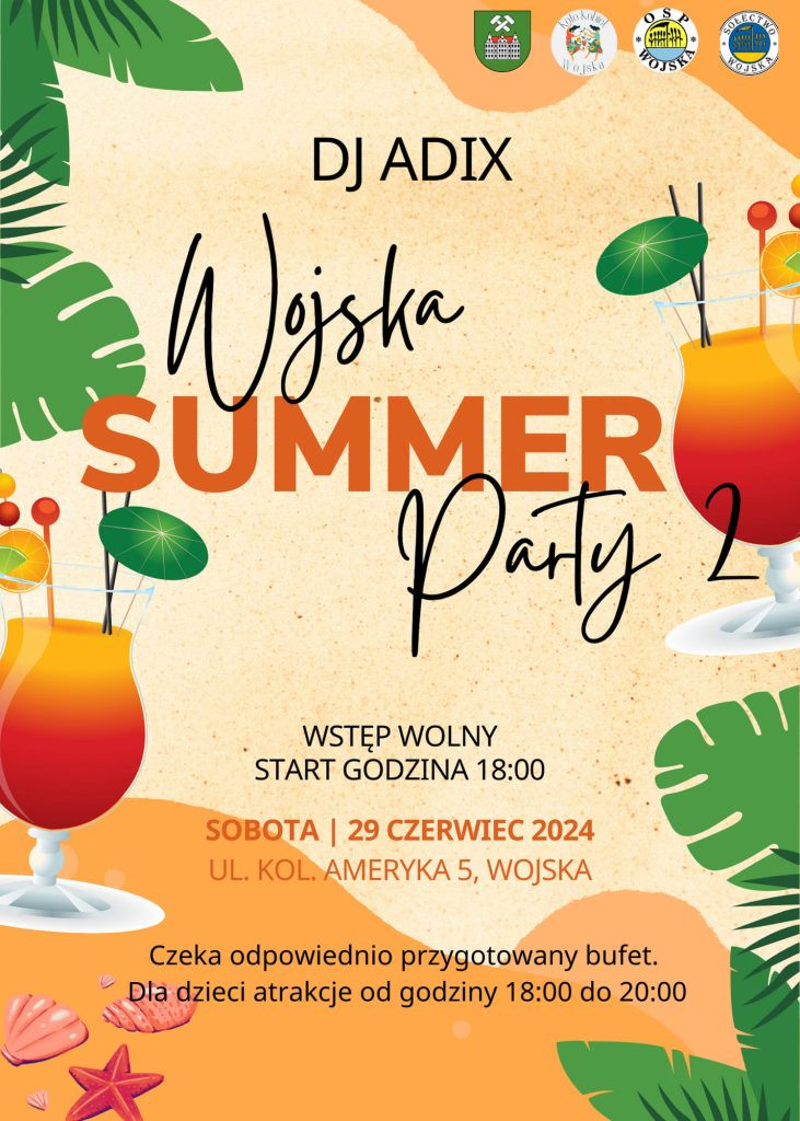 W Wojsce można zauważyć pierwsze powiewy lata! 29 czerwca o godz. 18 w miejscowej remizie odbędzie się „Wojska Summer Party 2” – druga edycja imprezy z okazji rozpoczęcia wakacji. Do wspólnej zabawy zapraszają: Sołectwo Wojska, Koło Kobiet Wojszczanki, OSP Wojska oraz Gmina Tworóg. O oprawe muzyczną zadba DJ Adix. Wstęp wolny, zapraszamy!