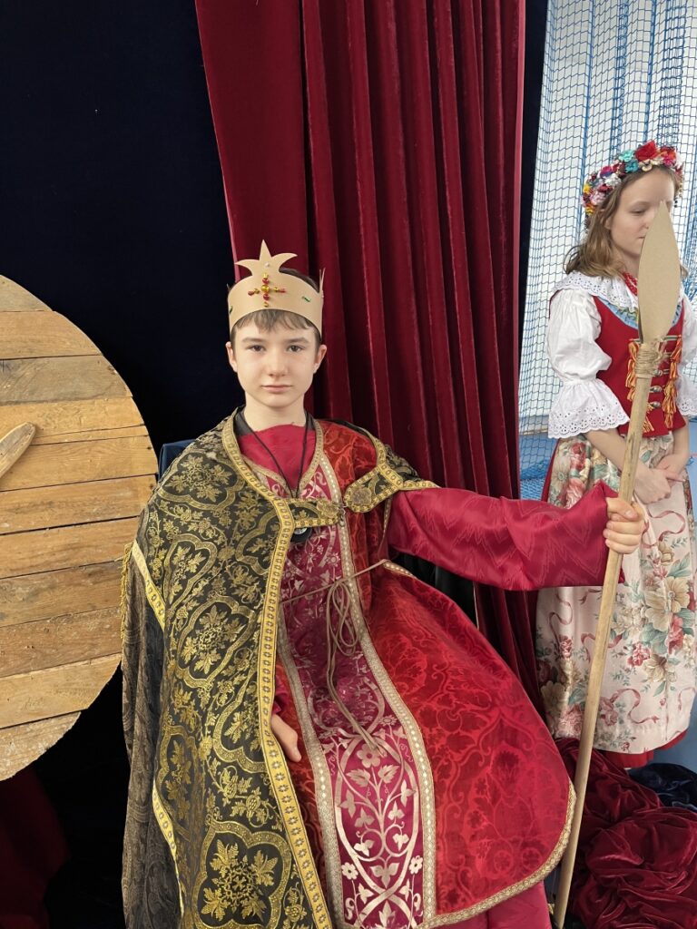 Dzień 14 kwietnia, dzień w szkole podstawowej w Boruszowicach niezwykły – czas świętowania i pamięci o historycznych wydarzeniach, czyli Chrzcie Polski. To między innymi dlatego od samego rana panowała wśród uczniów i nauczycieli historyczna atmosfera. Po szkolnych korytarzach spacerowały królewny i księżniczki, rozmowy prowadzili królowie, paziowie i rycerze, którzy – choć prezentowali miecze – nie byli skorzy do walki. Na górnym holu uczniowie z uwagą obejrzeli wystawę portretów władców Polski i wysłuchali komentarza nauczyciela.