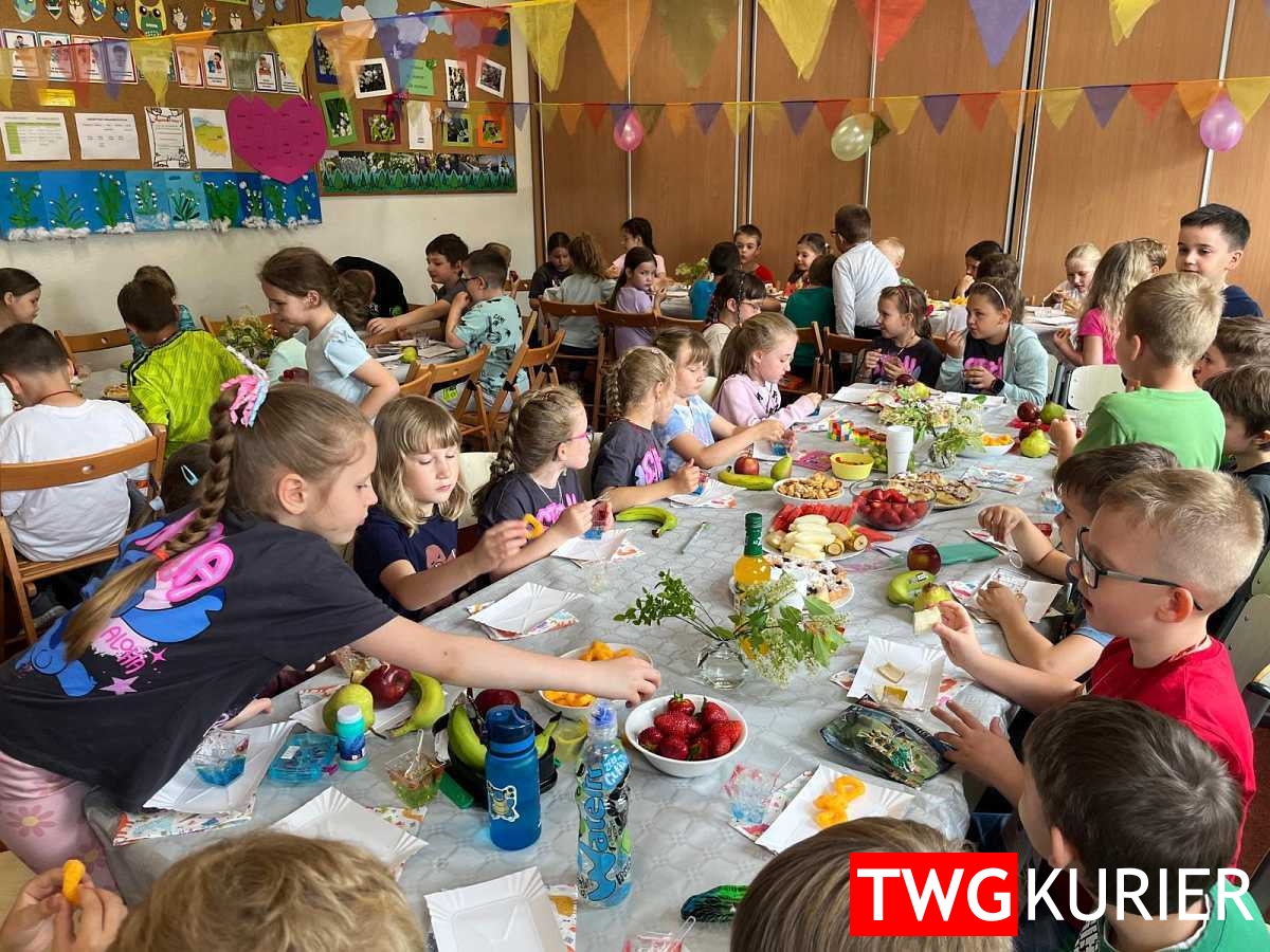 We wtorek, 3 czerwca, uczniowie wszystkich klas spotkali się w sali gimnastycznej na wspólnym, zdrowym śniadaniu. Siedząc na kocykach, w miłej atmosferze, dzielili się posiłkiem i uśmiechem.